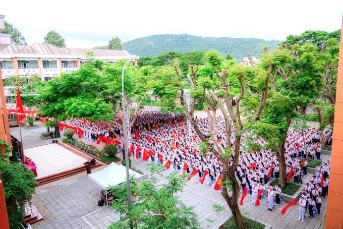 Thầy trò Trường THCS Trần Phú (phường Tam Thắng) chào đón năm học mới 2025-2026 giữa không gian rực rỡ cờ, hoa. Ảnh: KHÁNH CHI/SGGP