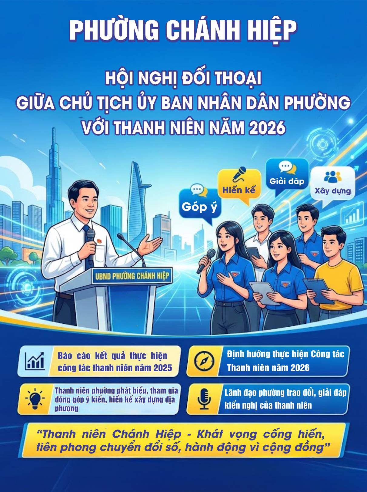 Thực hiện Chương trình công tác thanh niên năm 2026, Ủy ban nhân dân phường Chánh Hiệp tổ chức Hội nghị đối thoại giữa Chủ tịch Ủy ban nhân dân phường với thanh niên trên địa bàn phường năm 2026. Hội nghị sẽ diễn ra vào lúc 14 giờ 00 phút, ngày 16 tháng 4 năm 2026 tại Hội trường Đảng ủy phường Chánh Hiệp.