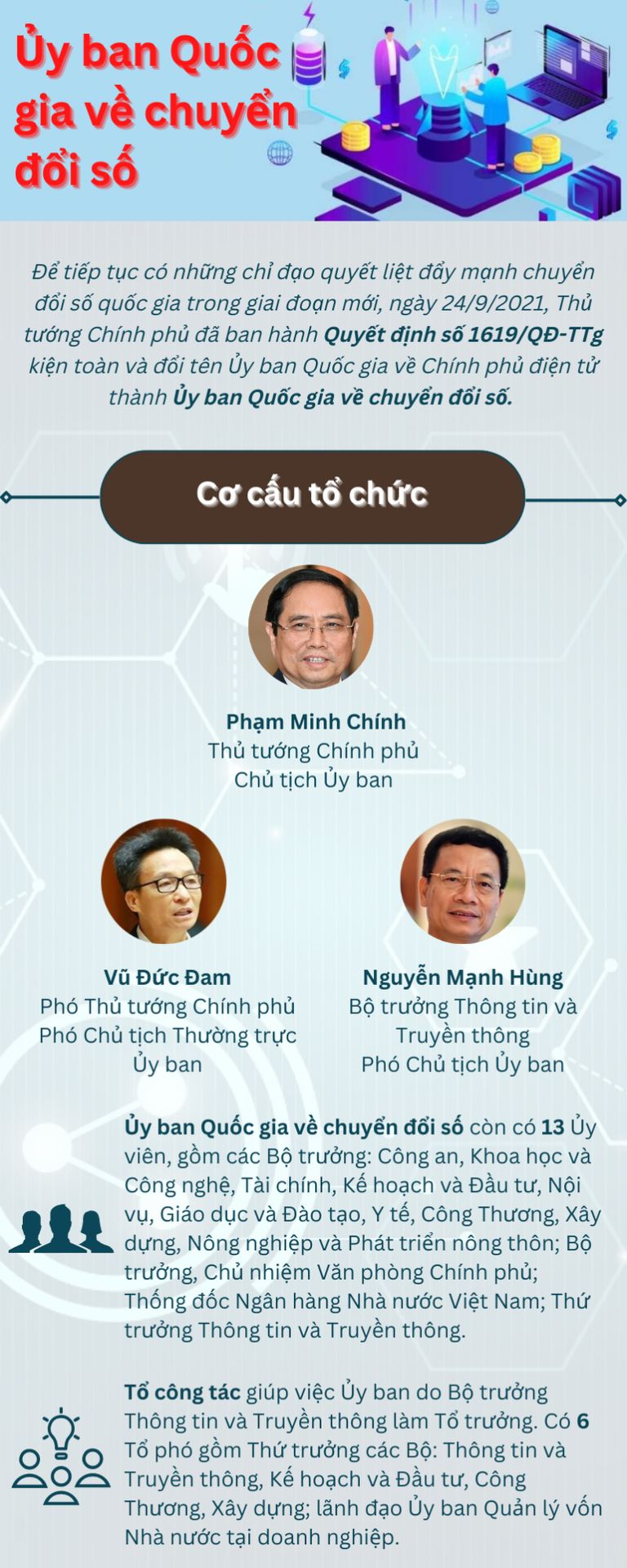 Để tiếp tục có những chỉ đạo quyết liệt đẩy mạnh chuyển đổi số quốc gia trong giai đoạn mới, ngày 24/9/2021, Thủ tướng Chính phủ đã ban hành Quyết định số 1619/QĐ-TTg kiện toàn và đổi tên Ủy ban Quốc gia về Chính phủ điện tử thành Ủy ban Quốc gia về chuyển đổi số. Thủ tướng Chính phủ làm Chủ tịch Ủy ban.