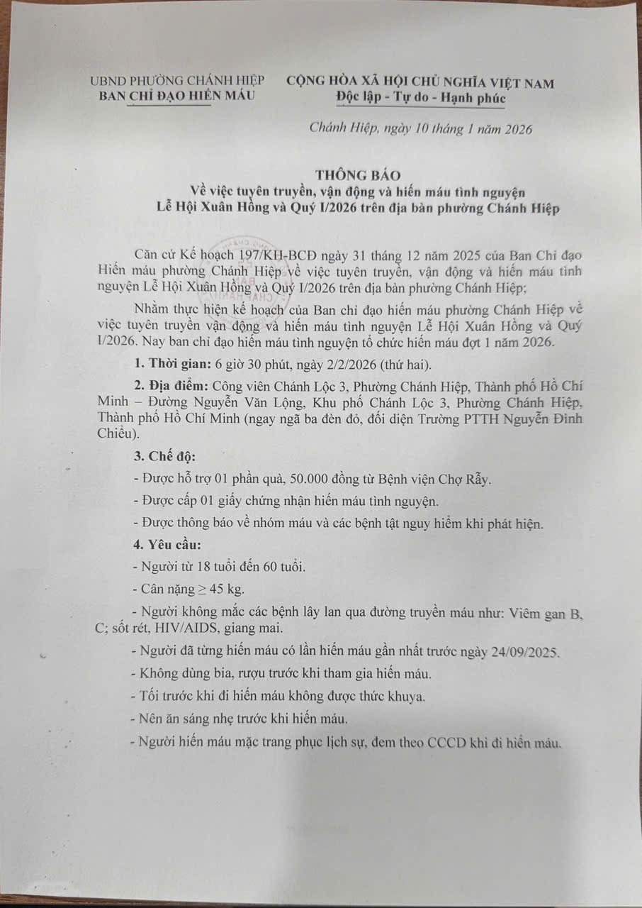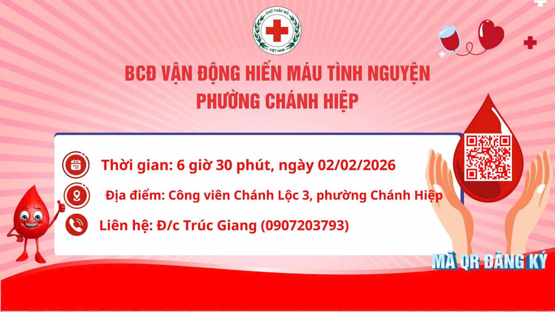 ❤️ Ban chỉ đạo Hiến máu tình nguyện phường Chánh Hiệp rất mong sự quan tâm, hưởng ứng và vận động tham gia của Anh, Chị, Em, Bạn bè, Quý Đồng nghiệp và cộng đồng, cùng chung tay tham gia Ngày hội Hiến máu tình nguyện Xuân Hồng năm 2026.