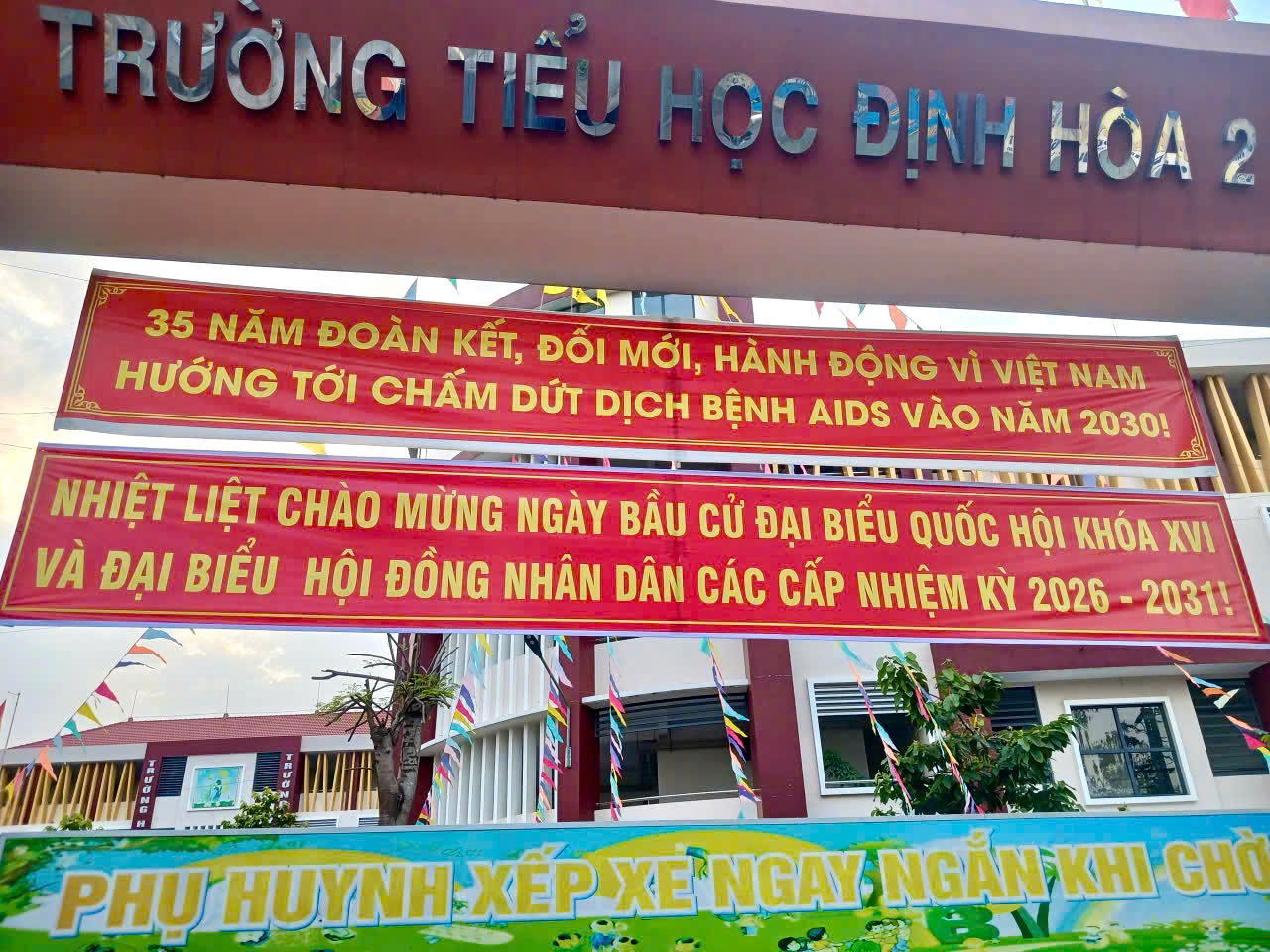 Nhiều trường học như: Trường Tiểu học Định Hòa 2, Trường Tiểu học Kim Đồng, Trường Tiểu học Tương Bình Hiệp, Trường THCS Tương Bình Hiệp, Trường THCS Định Hòa, Trường Mầm non Hoa Sen, Trường Mầm non Hoa Cúc… đã chủ động phối hợp trang trí, treo cờ, băng rôn, khẩu hiệu tại cổng trường và trong khuôn viên, góp phần lan tỏa thông điệp về ngày hội lớn của toàn dân. Song song với công tác cổ động trực quan, các nhà trường còn lồng ghép nội dung tuyên truyền về bầu cử trong các buổi sinh hoạt dưới cờ, hoạt động ngoại khóa, giáo dục công dân, giúp học sinh hiểu rõ ý nghĩa của bầu cử, hình thành ý thức công dân, tinh thần trách nhiệm đối với quê hương, đất nước.