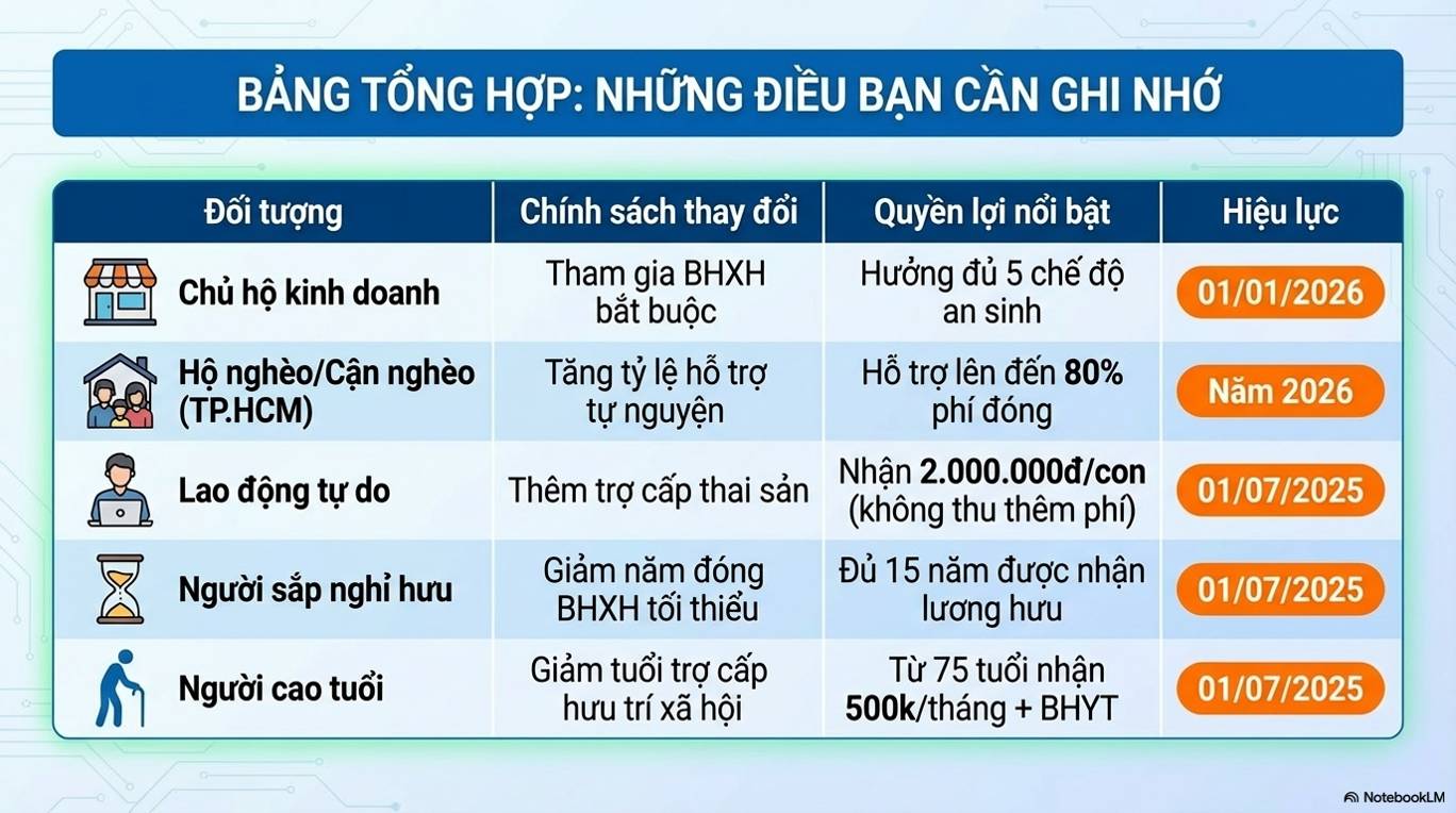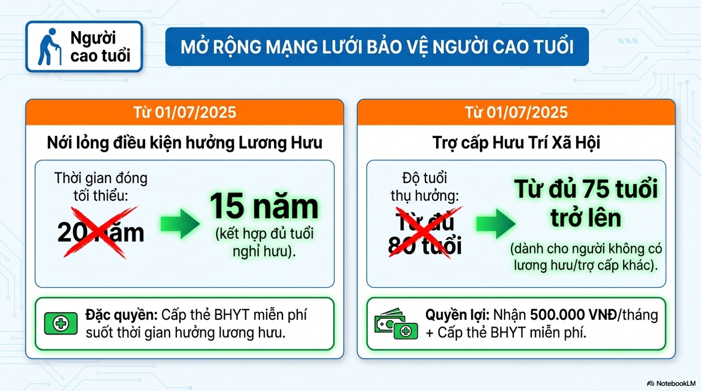 Từ ngày 01/7/2025, theo Luật Bảo hiểm xã hội năm 2024, công dân Việt Nam từ đủ 75 tuổi trở lên không có lương hưu hoặc trợ cấp BHXH hằng tháng (trừ trường hợp khác) sẽ được hưởng trợ cấp hưu trí xã hội 500.000 đồng/tháng và được cấp thẻ BHYT miễn phí, nhằm nâng cao an sinh cho người cao tuổi. Chính sách này thay thế và mở rộng đối tượng so với quy định trước đây (từ đủ 80 tuổi).