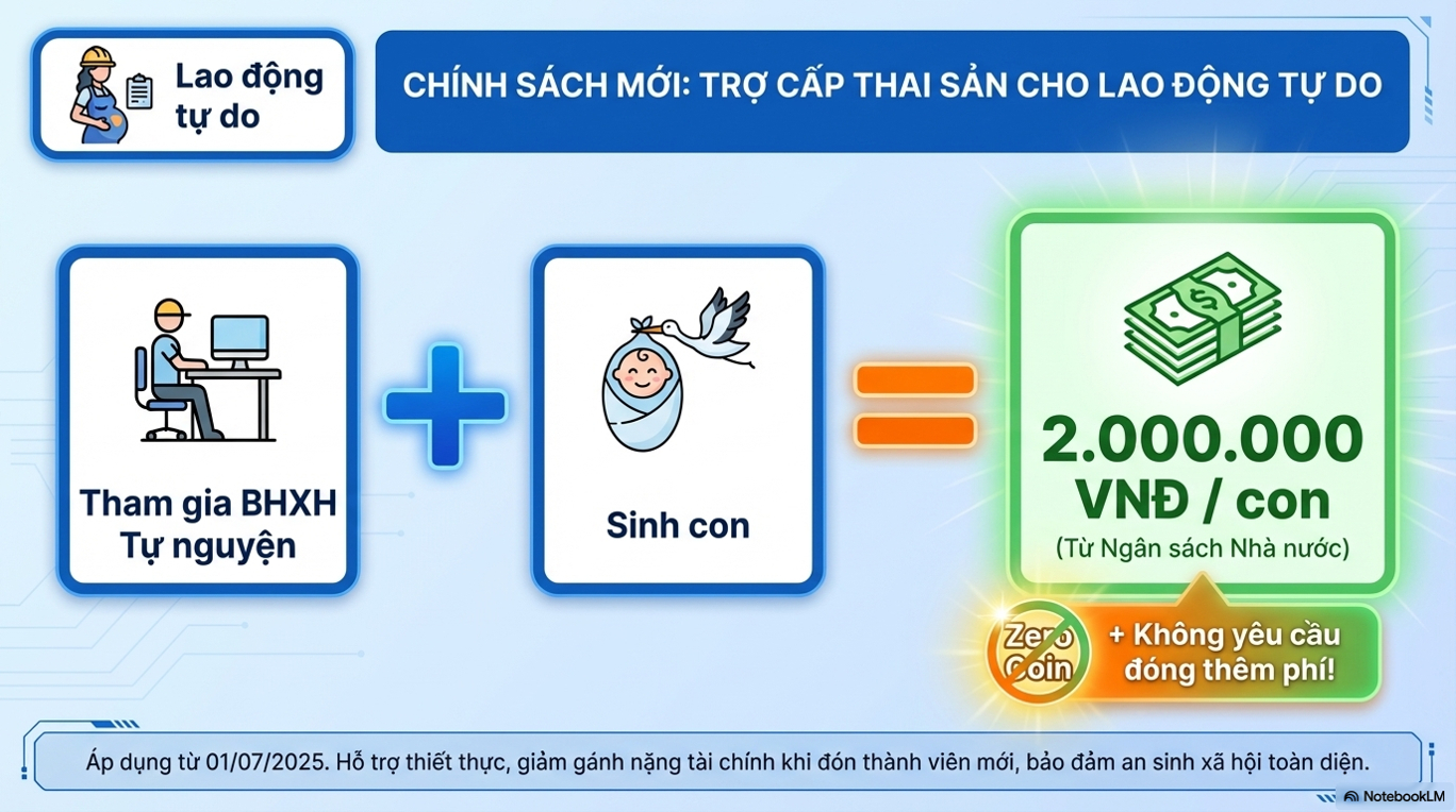 Từ ngày 01/7/2025, theo Luật Bảo hiểm xã hội năm 2024, người tham gia BHXH tự nguyện (bao gồm lao động tự do) khi sinh con sẽ được hưởng trợ cấp thai sản 2.000.000 đồng/con do Ngân sách Nhà nước chi trả. Đây là chính sách mới, góp phần giảm bớt gánh nặng tài chính mà không yêu cầu đóng thêm phí, hỗ trợ thiết thực cho lao động tự do khi đón thành viên mới, bảo đảm an sinh xã hội toàn diện.