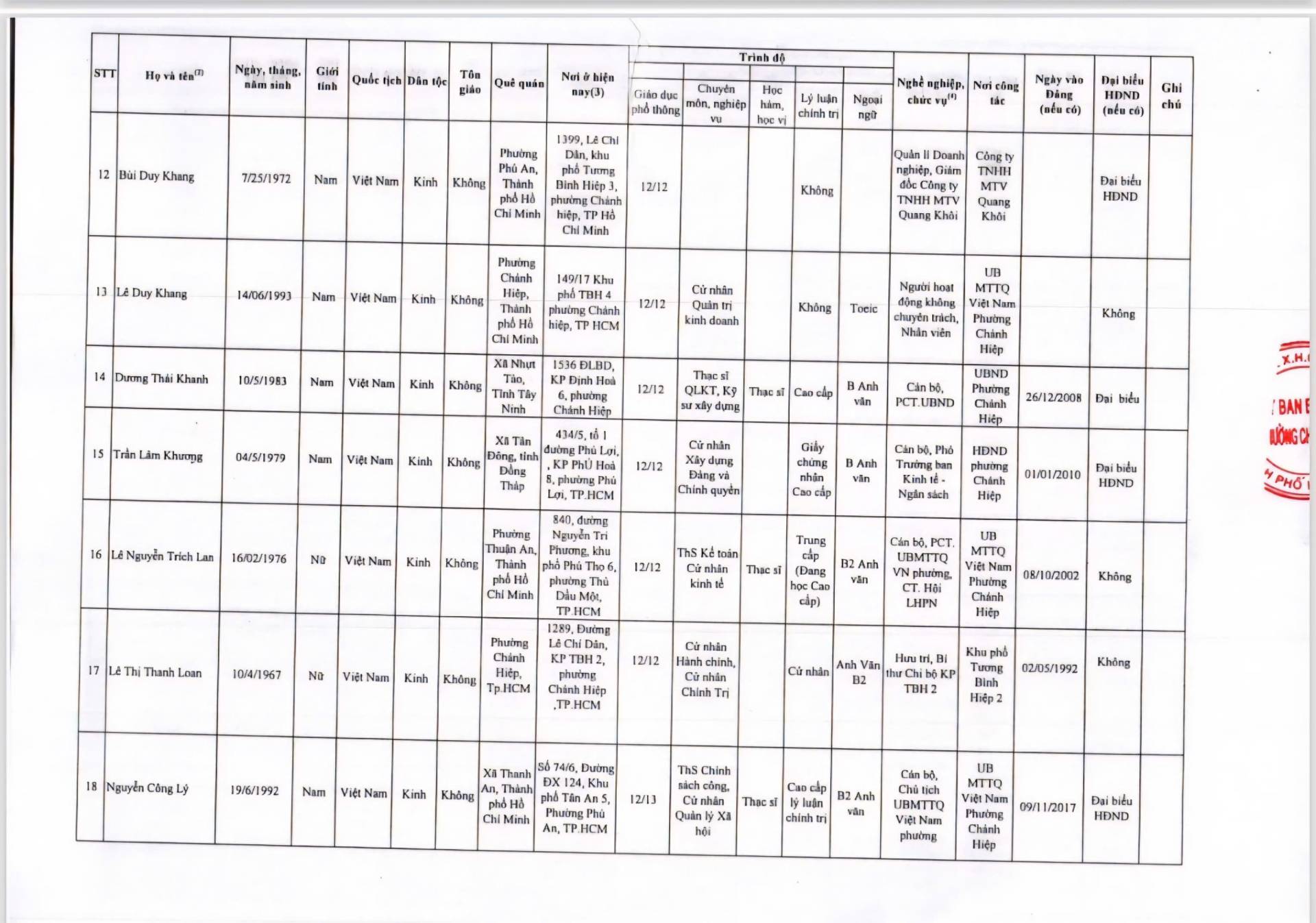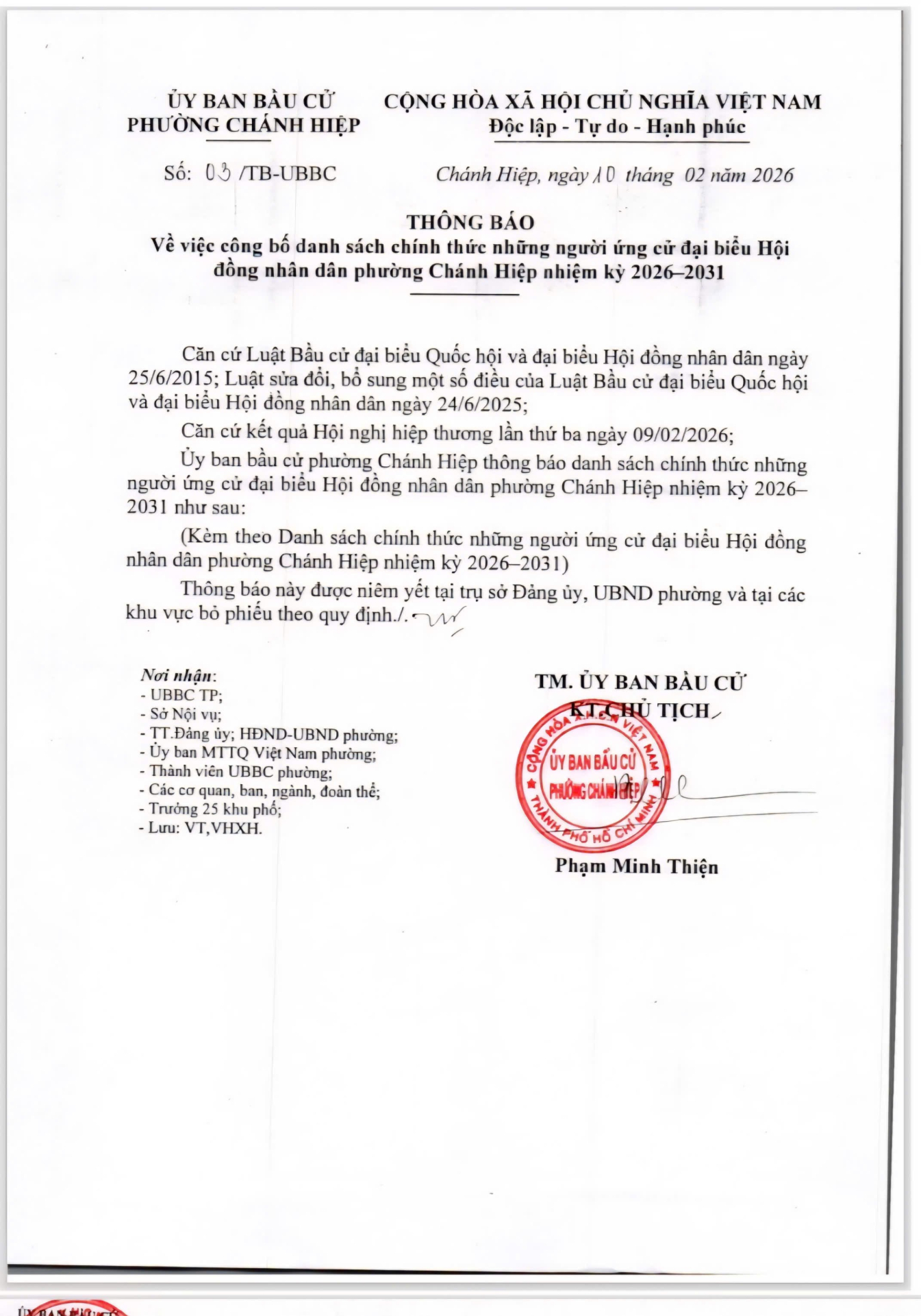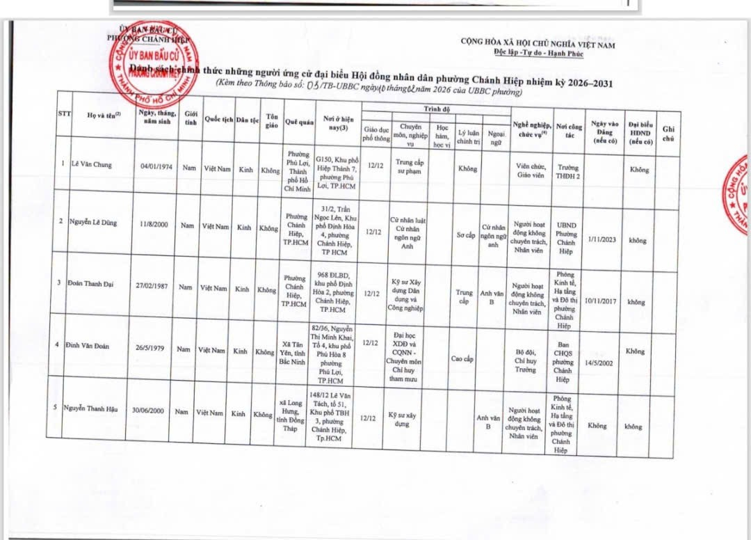 PHƯỜNG CHÁNH HIỆP THÔNG BÁO VỀ VIỆC CÔNG BỐ DANH SÁCH CHÍNH THỨC NHỮNG NGƯỜI ỨNG CỬ ĐẠI BIỂU HỘI ĐỒNG NHÂN DÂN PHƯỜNG CHÁNH HIỆP NHIỆM KỲ 2026-2031