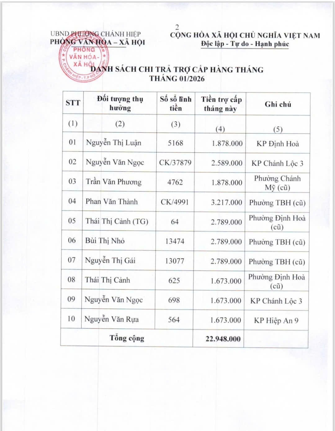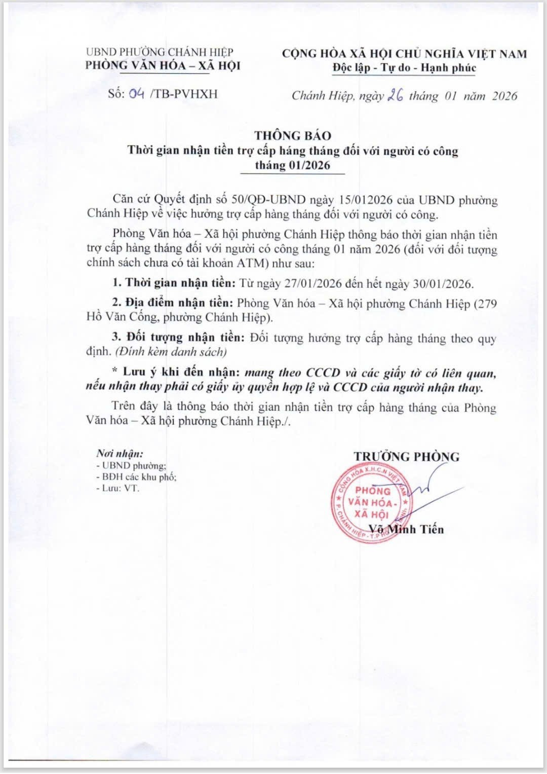 2. Địa điểm nhận tiền: Phòng Văn hóa – Xã hội phường Chánh Hiệp (279 Hồ Văn Cống, phường Chánh Hiệp).