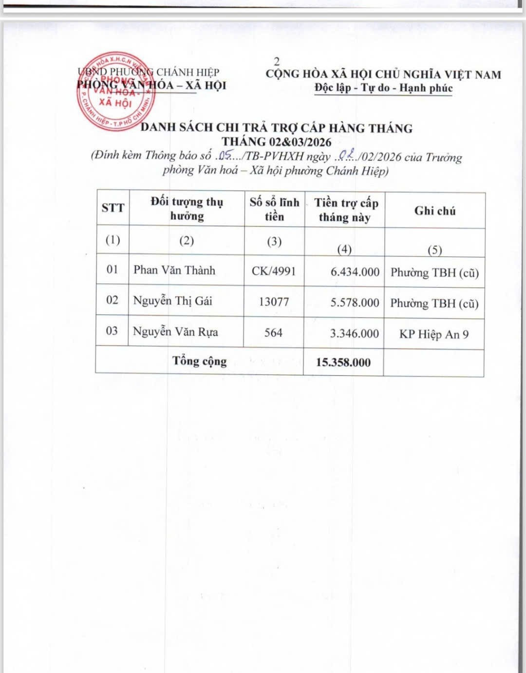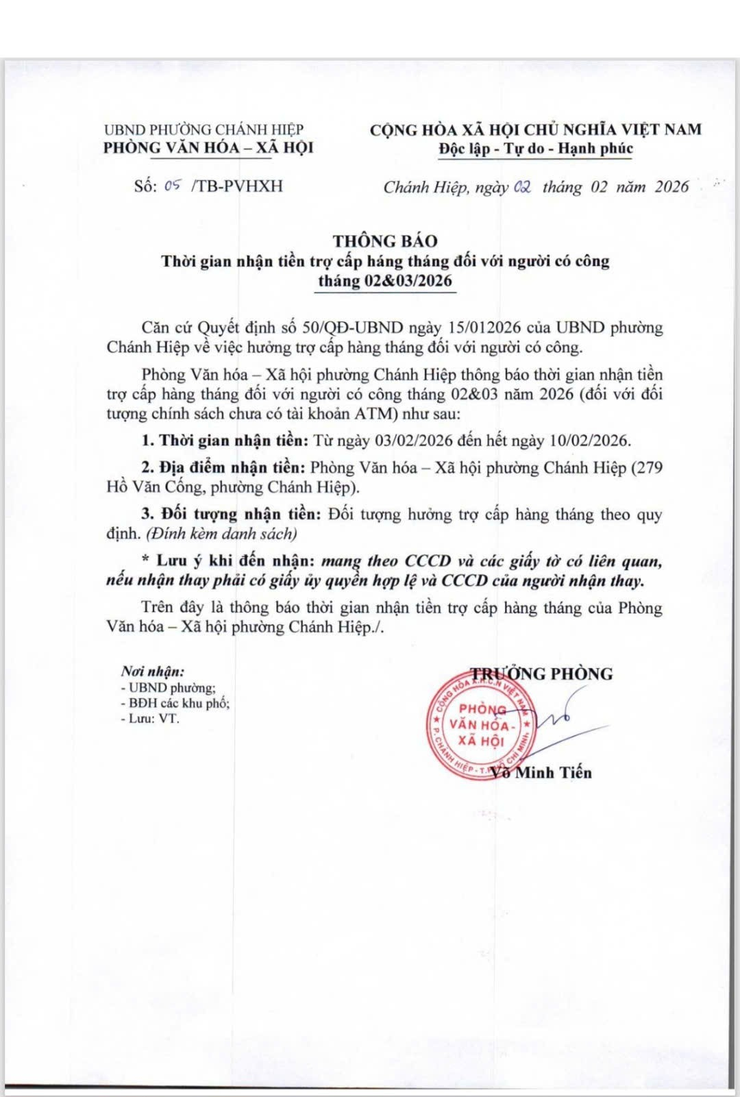 Thực hiện Quyết định số 50/QĐ-UBND ngày 15/01/2026 của Ủy ban nhân dân phường Chánh Hiệp về việc chi trả trợ cấp hằng tháng đối với người có công, Phòng Văn hóa – Xã hội phường Chánh Hiệp thông báo thời gian nhận tiền trợ cấp hằng tháng tháng 02 và tháng 03 năm 2026 (đối với các đối tượng chưa có tài khoản ATM), cụ thể như sau: