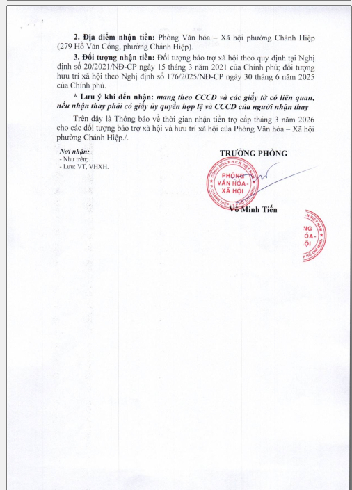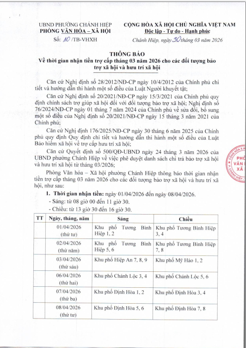 PHƯỜNG CHÁNH HIỆP: THÔNG BÁO VỀ THỜI GIAN NHẬN TIỀN TRỢ CẤP THÁNG 3 NĂM 2026 CHO CÁC ĐỐI TƯỢNG BẢO TRỢ XÃ HỘI VÀ HƯU TRÍ XÃ HỘI