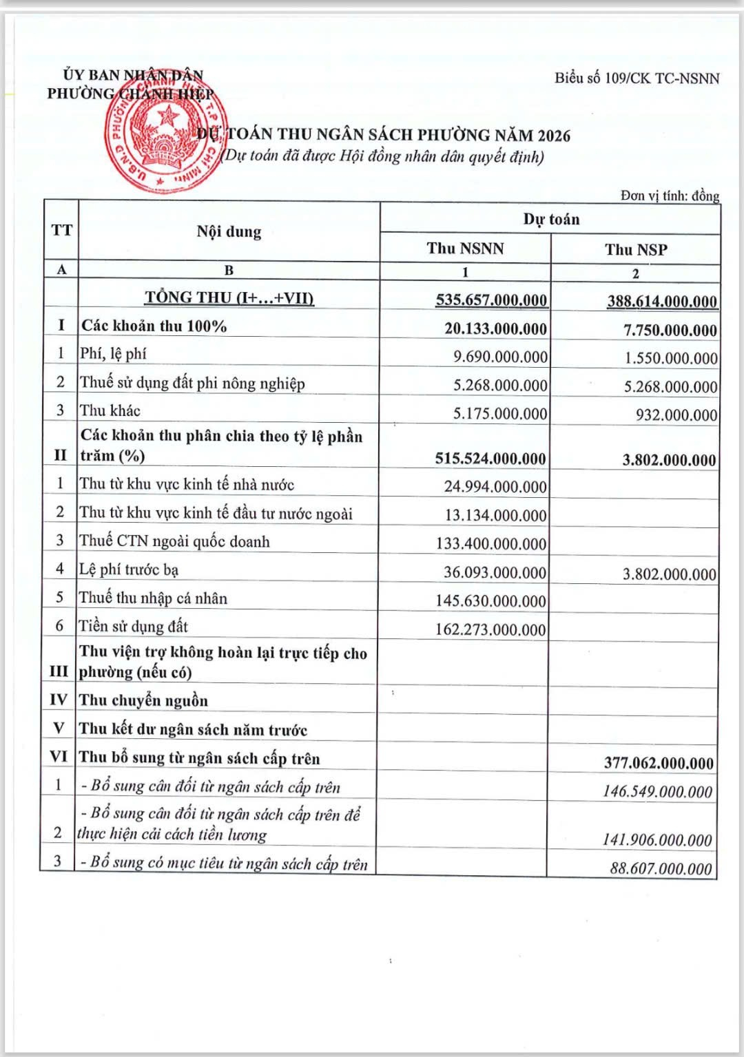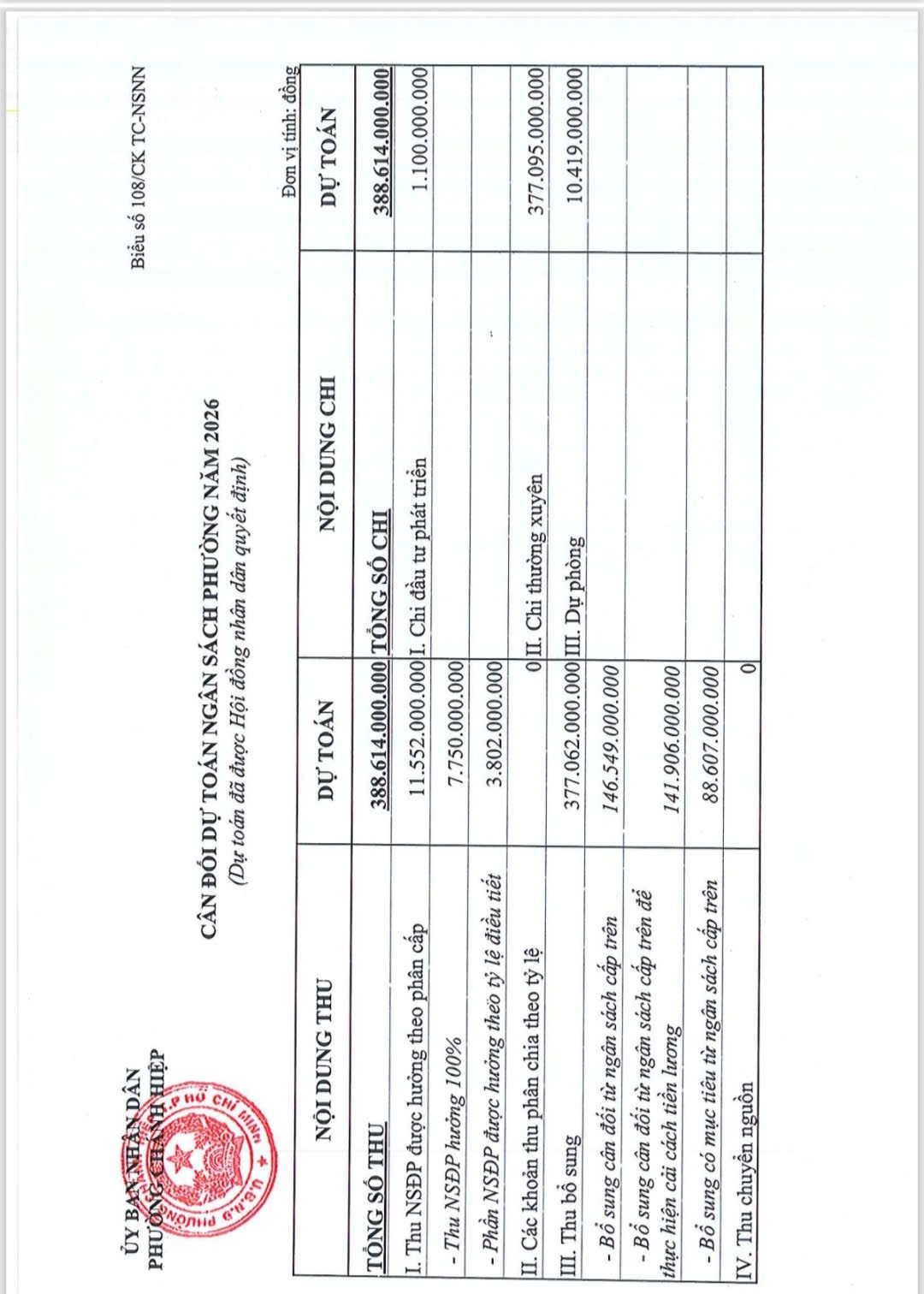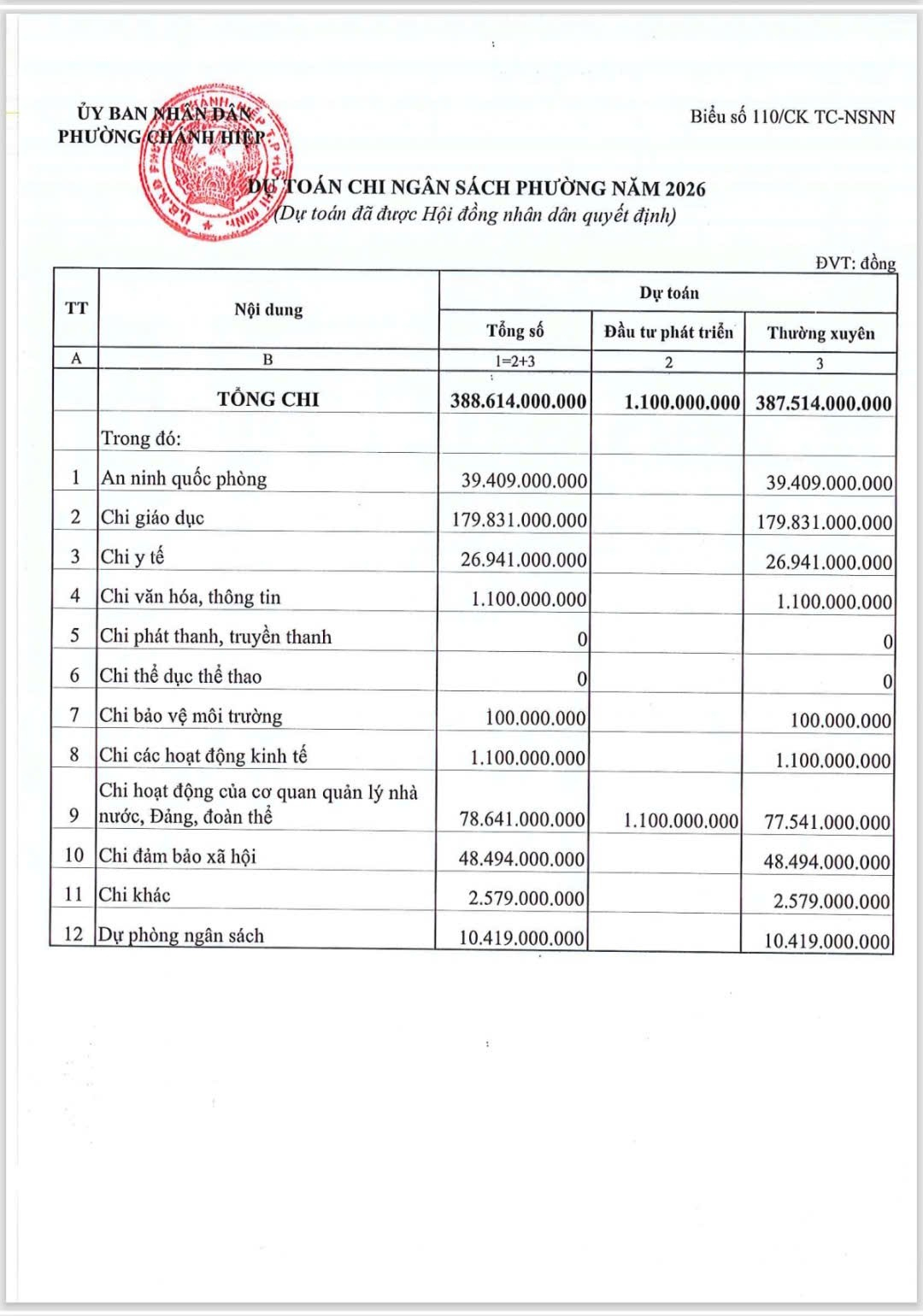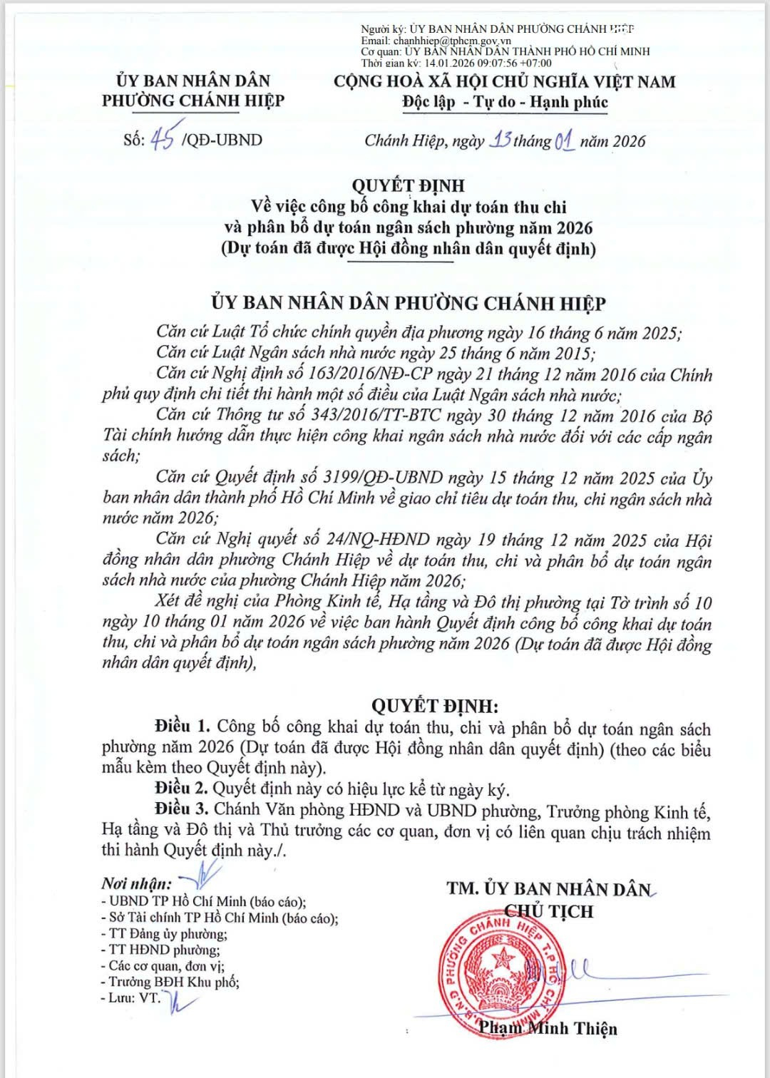 UBND PHƯỜNG CHÁNH HIỆP BAN HÀNH QUYẾT ĐỊNH VỀ VIỆC CÔNG BỐ CÔNG KHAI DỰ TOÁN THU CHI VÀ PHÂN BỔ DỰ TOÁN NGÂN SÁCH PHƯỜNG NĂM 2026 (DỰ TOÁN ĐÃ ĐƯỢC HỘI ĐỒNG NHÂN DÂN QUYẾT ĐỊNH)
