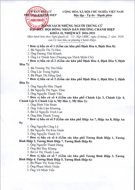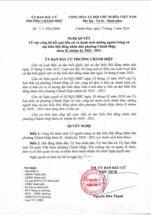 ỦY BAN BẦU CỬ PHƯỜNG CHÁNH HIỆP BAN HÀNH NGHỊ QUYẾT SỐ 03/NQ-UBBC VỀ VIỆC CÔNG BỐ KẾT QUẢ BẦU CỬ VÀ DANH SÁCH NHỮNG NGƯỜI TRÚNG CỬ ĐẠI BIỂU HỘI ĐỒNG NHÂN DÂN PHƯỜNG CHÁNH HIỆP KHÓA II, NHIỆM KỲ 2026 - 2031.