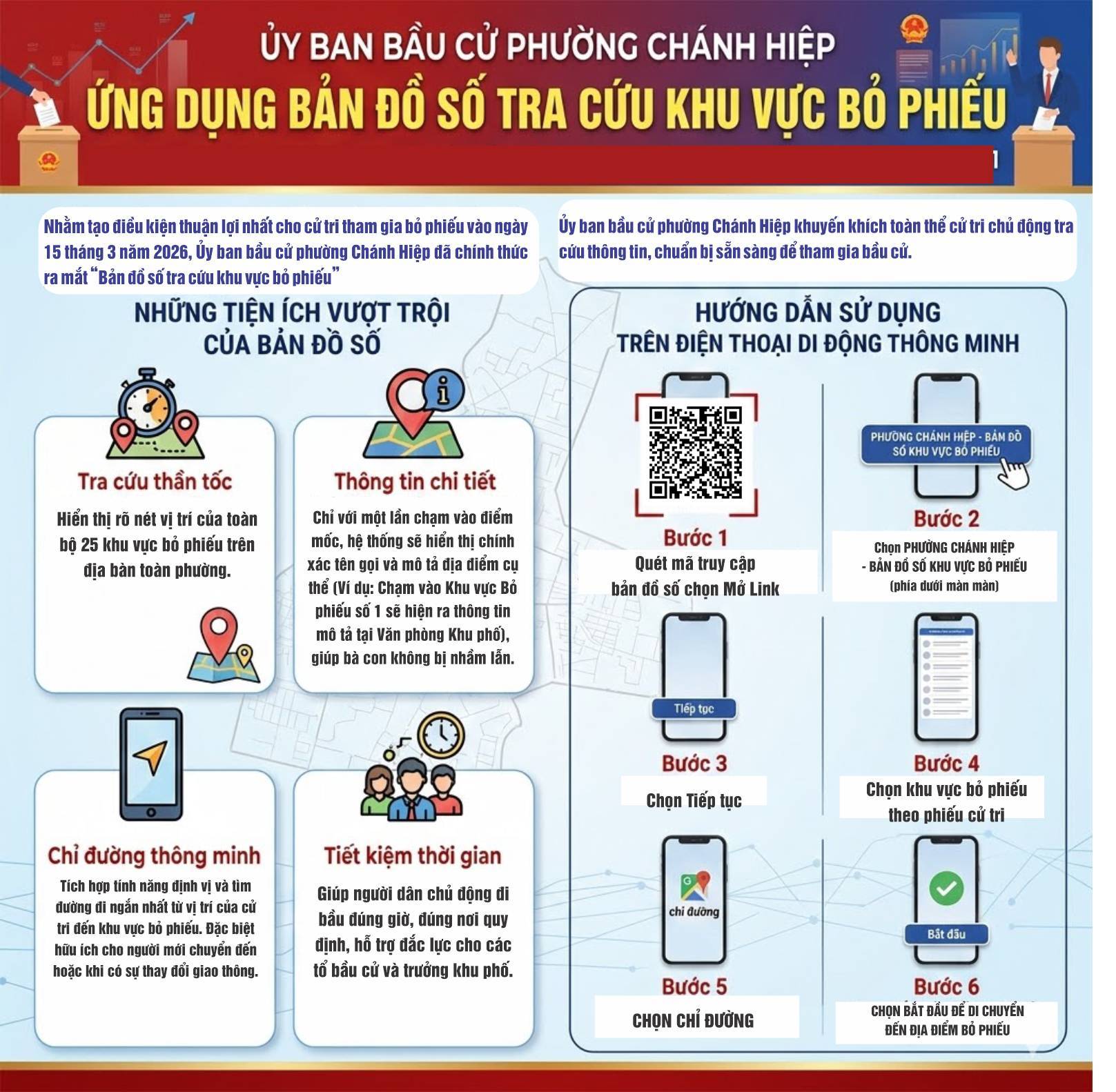 Phường Chánh Hiệp đẩy mạnh chuyển đổi số - Hướng tới Bầu cử các cấp nhiệm kỳ 2026 - 2031 Nhằm tạo điều kiện thuận lợi nhất cho cử tri tham gia bỏ phiếu vào ngày 15 tháng 3 năm 2026, Ủy ban bầu cử phường Chánh Hiệp đã chính thức ra mắt “Bản đồ số phục vụ Bầu cử đại biểu Quốc hội khóa XVI và đại biểu HĐND các cấp nhiệm kỳ 2026 – 2031” thể hiện quyết tâm của phường Chánh Hiệp trong việc ứng dụng công nghệ vào công tác tổ chức ngày hội toàn dân. NHỮNG TIỆN ÍCH VƯỢT TRỘI CỦA BẢN ĐỒ SỐ Tra cứu thần tốc: Hiển thị rõ nét vị trí của toàn bộ 25 khu vực bỏ phiếu trên địa bàn toàn phường. Thông tin chi tiết: Chỉ với một lần chạm vào điểm mốc, hệ thống sẽ hiển thị chính xác tên gọi và mô tả địa điểm cụ thể (Ví dụ: Chạm vào Khu vực Bỏ phiếu số 1 sẽ hiện ra thông tin mô tả tại Văn phòng Khu phố), giúp bà con không bị nhầm lẫn. Chỉ đường thông minh: Tích hợp tính năng định vị và tìm đường đi ngắn nhất từ vị trí của cử tri đến khu vực bỏ phiếu. Đặc biệt hữu ích cho người mới chuyển đến hoặc khi có sự thay đổi giao thông. Tiết kiệm thời gian: Giúp người dân chủ động đi bầu đúng giờ, đúng nơi quy định, hỗ trợ đắc lực cho các tổ bầu cử và trưởng khu phố. Ủy ban bầu cử phường Chánh Hiệp khuyến khích toàn thể cử tri chủ động tra cứu thông tin.